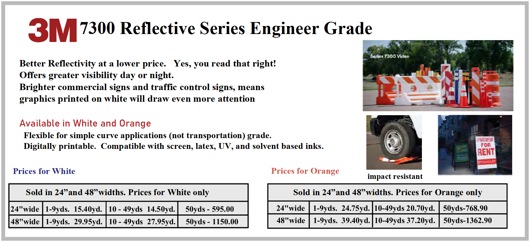 “3M™ Advanced Flexible Engineer Grade Reflective Sheeting, 7310 White and 7314 Orange are printable, conformable, scratch and impact resistant.