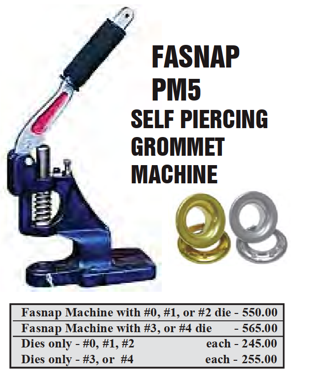 The PM5 machine is an industry standard heavy duty bench-mounted machine. It is made of tough ductile iron and has a deep throat with a longer padded handle. This machine uses Fasnap dies that set self-piercing grommets from size 0 up to size 4 and snap fasteners in one motion, swiftly and efficiently.